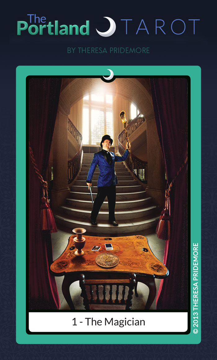 With the right duds and this pose in mind, I had to find the perfect location to match the energy that Lee brought to the shoot. When I discovered the beautiful stairwell in the foyer of the Pittock Mansion, it was decided. I just loved the double-helix effect it created and how the light from the window wrapped around him. With his staff held high, the Magician most definitely felt like he was grabbing light from the sky and translating it into color and form… just like a gifted artist would.